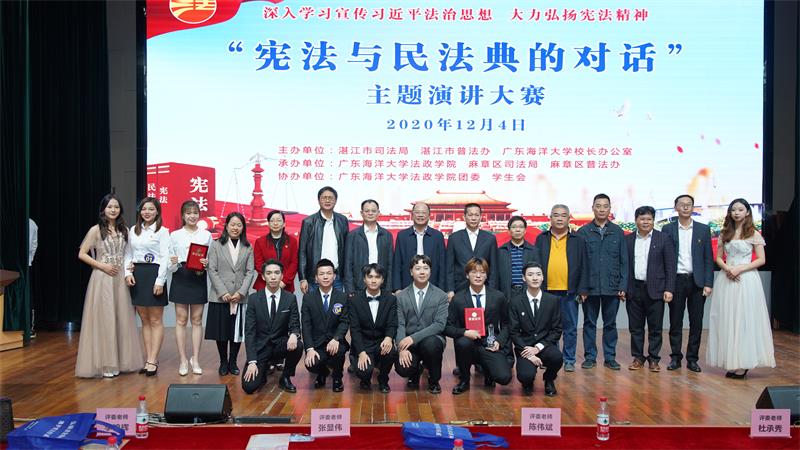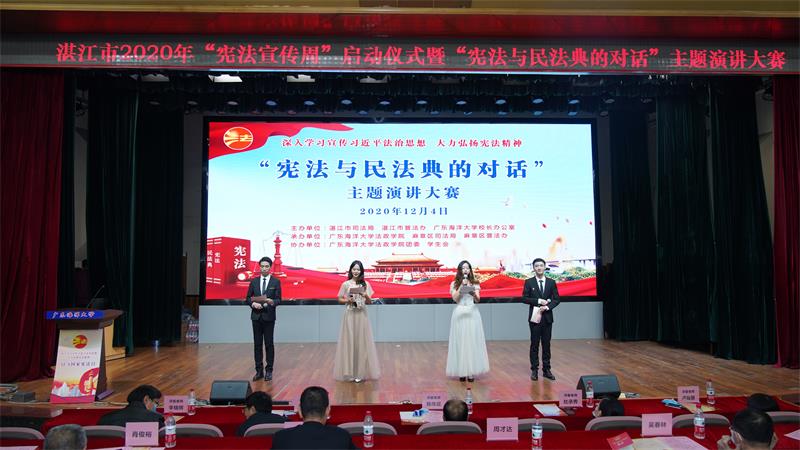 为深入学习宣传习近平法治思想,大力弘扬宪法精神。12月4日(第七个国家宪法日),由市委依法治市办、市司法局、市普法办、tyc122cc太阳成集团董事长办公室主办,tyc122cc太阳成集团、麻章区司法局、麻章区普法办承办的2020年湛江市“宪法宣传周”启动仪式暨“宪法与民法典的对话”主题演讲大赛活动在tyc122cc太阳成集团湖光校区多功能厅顺利举行。市政府副秘书长、市信访局党组书记、局长周才达,市司法局二级调研员、市普法办常务副主任李军,市司法局四级调研员、市普法办副主任吴春林、tyc122cc太阳成集团tyc122cc太阳成集团党委书记陈伟斌、经理张显伟、党委副书记许国炯、tyc122cc太阳成集团董事长办公室副主任李鹏虹等有关领导出席活动。
