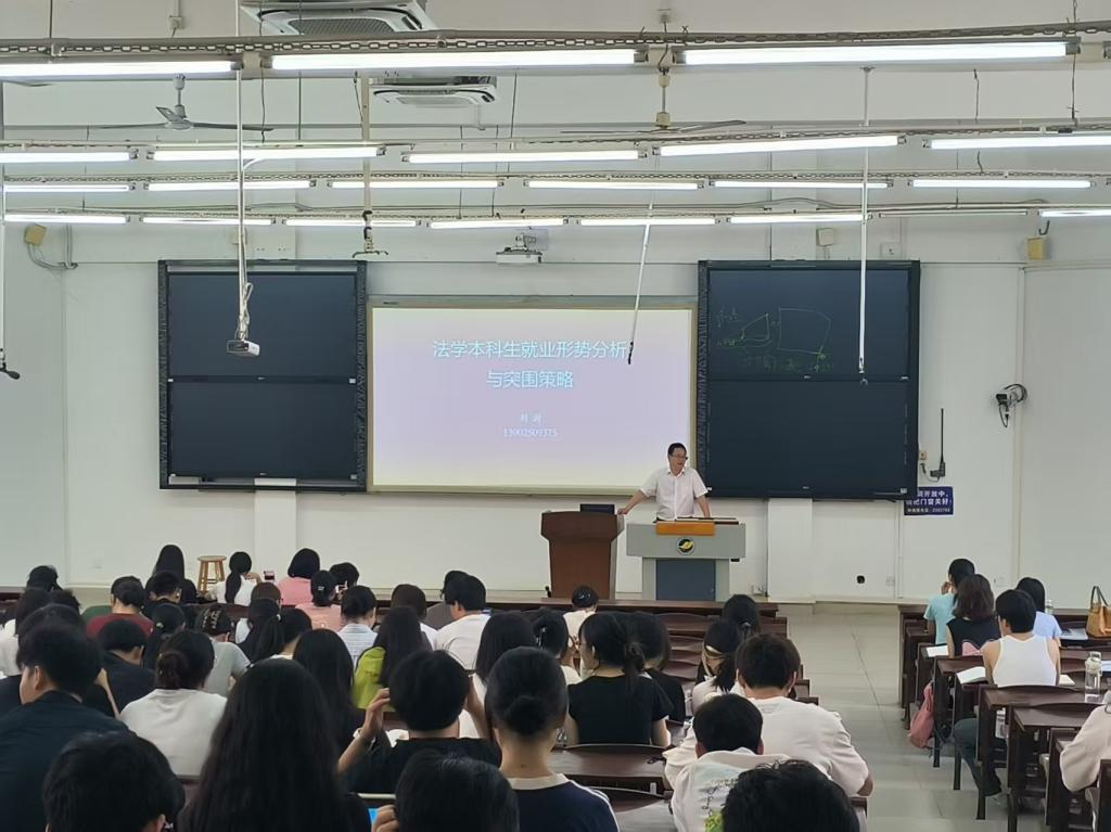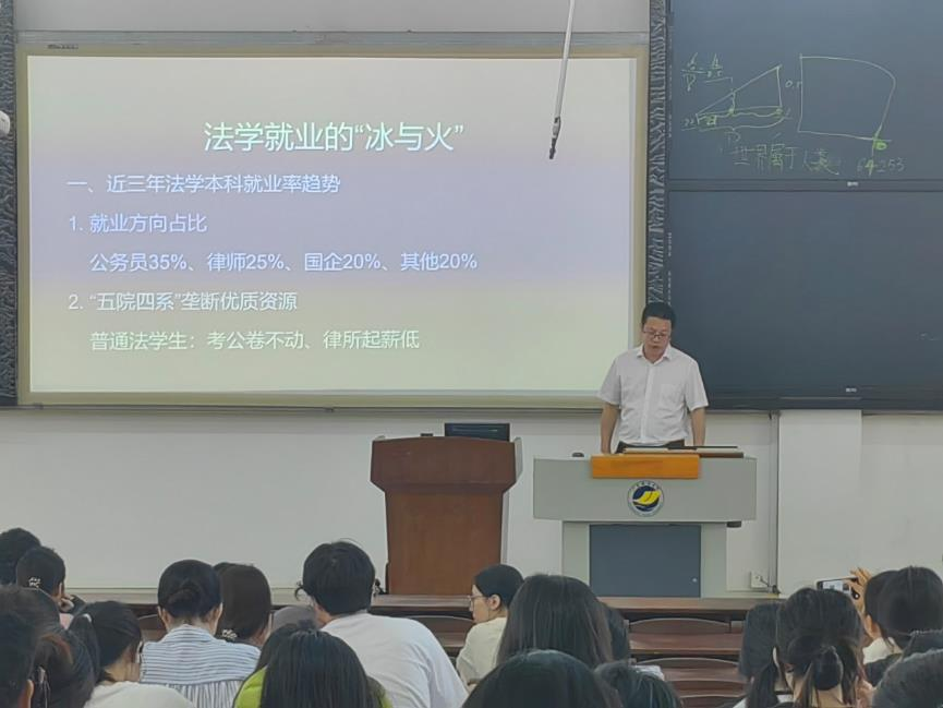 会上,刘澍副经理以霞山区司法局司法协理员的招聘要求为例,指出法考对于提升法学就业竞争力的重要性与必要性。他详细分析了近三年法学本科就业率趋势,就公务员、律师、合同制岗位等法学就业的主要去向进行了多角度多维度的分析,阐明了法学就业主要岗位的利与弊,点明了普通法员工的主要就业困境,并就这些困境提出了较为中肯的建议和意见。他认为,作为大三法学员工,同学们要清晰职业规划,着重提升自身就业竞争力,在深化专业技能、夯实法律素养的基础上,要积极学习其他新兴技术、提升语言能力、提高综合素质,朝着复合型人才努力。