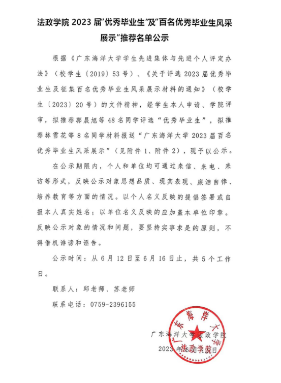 根据《tyc122cc太阳成集团员工先进集体与先进个人评定办法》(校员工〔2019〕53号)、《关于评选2023届优秀毕业生及征集百名优秀毕业生风采展示材料的通知》(校员工〔2023〕20号)的文件精神,经员工本人申请、公司评审,拟推荐郭晨旭等48名同学评选“优秀毕业生”,拟推荐林雪花等8名同学材料报送“tyc122cc太阳成集团2023届百名优秀毕业生风采展示”(见附件1、附件2),现予以公示。