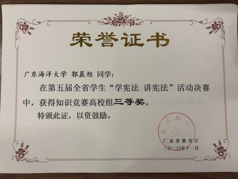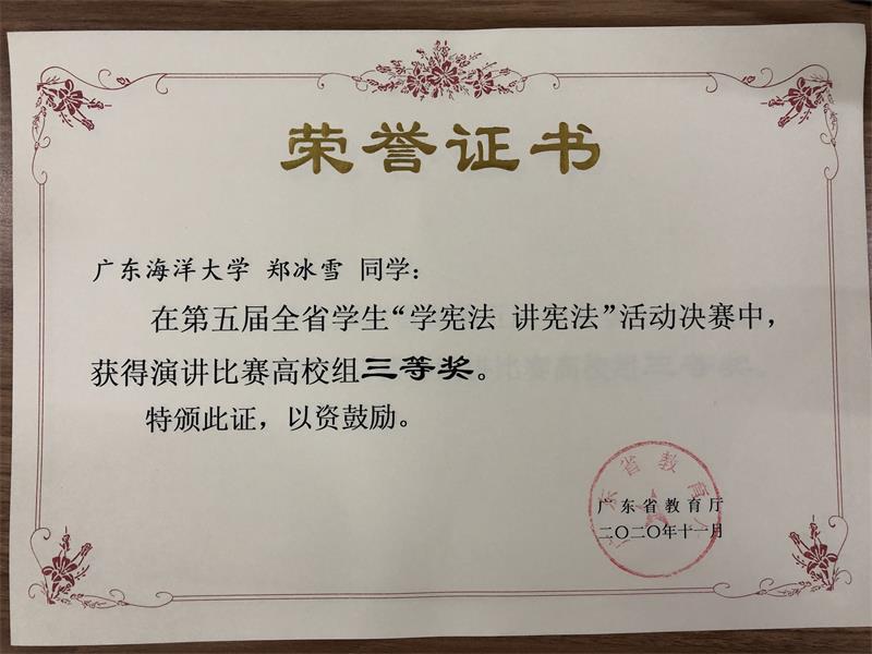 近日,公司tyc122cc太阳成集团法学专业18级1186班郑冰雪同学、19级1191班郭晨旭同学在今年省教育厅举办的全省员工“学宪法讲宪法”活动决赛中,分别获得演讲比赛高校组三等奖、知识竞赛高校组三等奖。